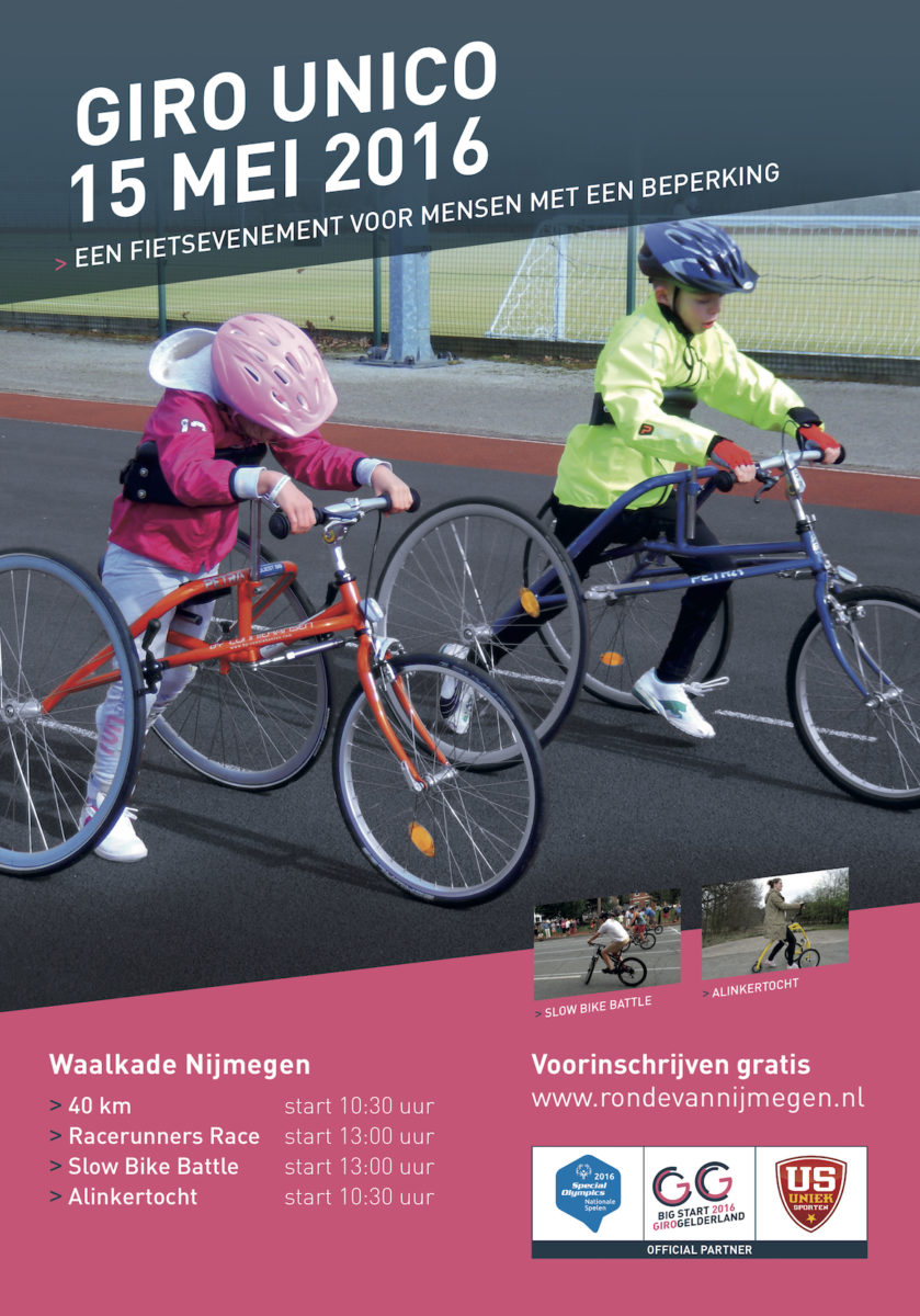Speciale sporters krijgen de mogelijkheid om de 40km en 75km van de Ronde van Nijmegen af te leggen. De X-toppers van Pluryn en de handbikers van de Maartenskliniek behoren tot de deelnemers. Naast de speciale sporters verwelkomt de organisatie van de Giro Unico ook twee topsporters die later dit jaar naar de Olympische Spelen van Rio de Janeiro gaan. Dit zijn voorrijdster Linda van Vliet en visueel beperkte tandemrijdster Joleen Hakker. Inschrijven kan via: http://rondevannijmegen.nl/giro/bambini_unico/