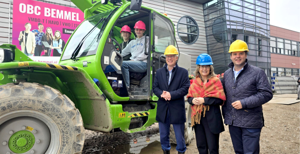 Het is niet iets wat je dagelijks mag doen: leerlingen Emma en Fien mochten tijdens de viering van het hoogste punt van de nieuwbouw van OBC Bemmel in een verreiker de vlag hijsen op de bouwplaats. Samen met rector...