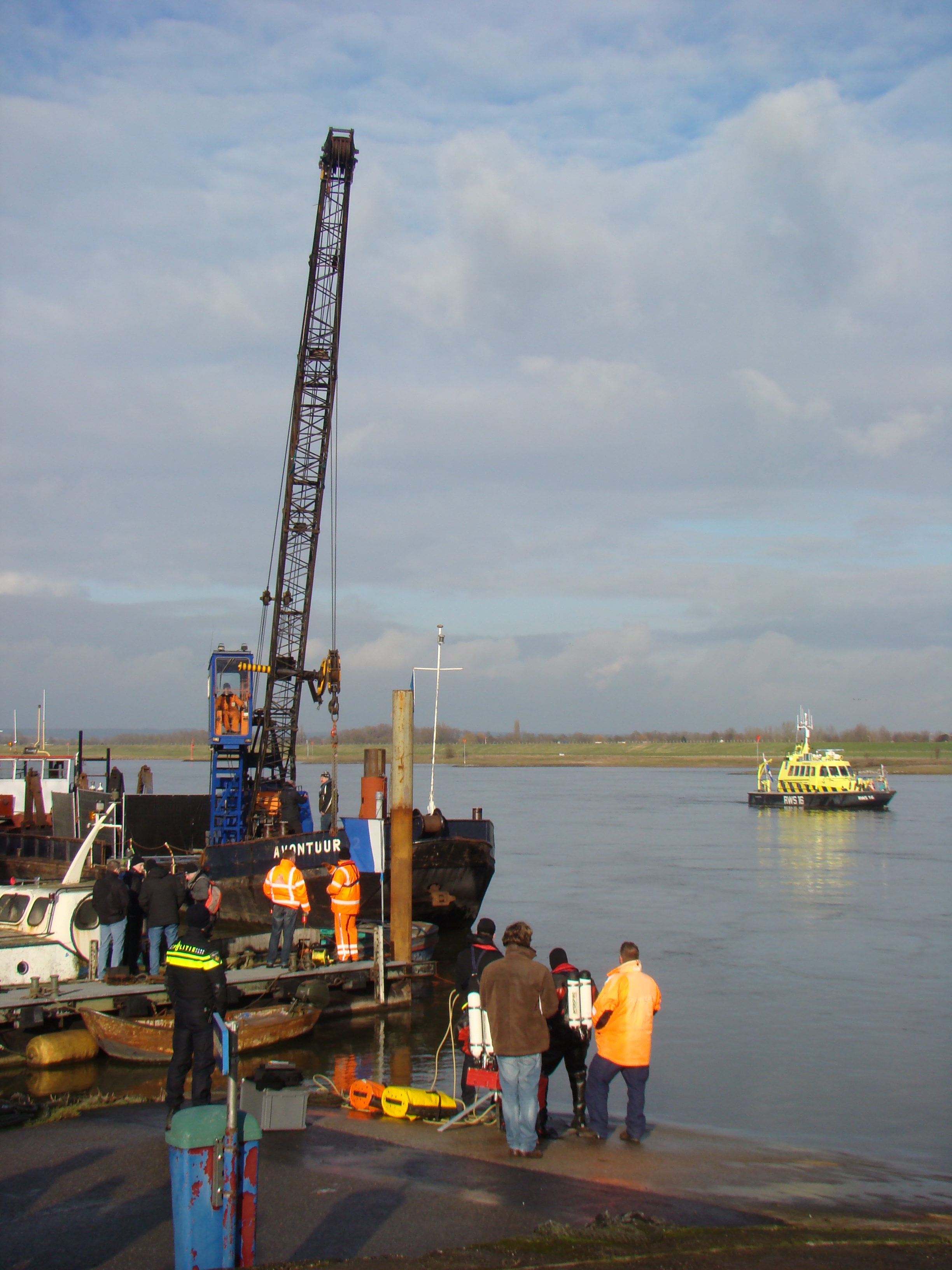 Rond één uur vanmiddag gingen duikers te water om kabels aan de auto vast te maken. De kraanboot, genaamd Avontuur 2, arriveerde rond twee uur. Nadat de kraanboot goed was gepositioneerd werd er begonnen met het bergen. Om drie uur kwam de blauwe Datsun van de Doornenburger boven water. De familie van Jos Mahler was aanwezig bij het bergen van de auto.