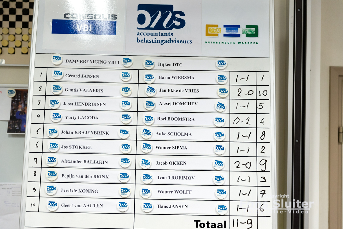 Damvereniging VBI Huissen boekte vanmiddag een nipte overwinning tegen landskampioen Hijken DTC. VBI Huissen stond voor aanvang van deze wedstrijd op de eerste plaats in de ereklasse, een punt voor landskampioen Hijken. Na drie uur en 46 minuten speeltijd maakte Gunter Valneris een einde aan de spanning en aan de tot dat moment gelijkopgaande partij. Bij een stand van 9-9 wist hij zijn partij tegen Jan Ekke de Vries te winnen en gingen de twee winstpunten naar VBI Huissen. Door deze winst lijken de Huissenaren op weg naar de landstitel.
