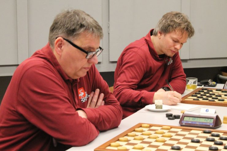 De wedstrijd begon met een reeks remises. Vadim Virny, Odin Mol, Jos Stokkel, Casper Remeijer, invalster Fleur Kruysmulder en oud-wereldkampioen Valneris hielden hun tegenstanders keurig in bedwang. Na zes partijen stond het nog gelijk.