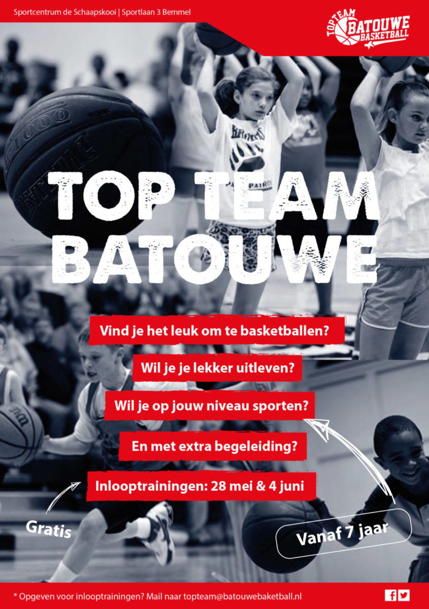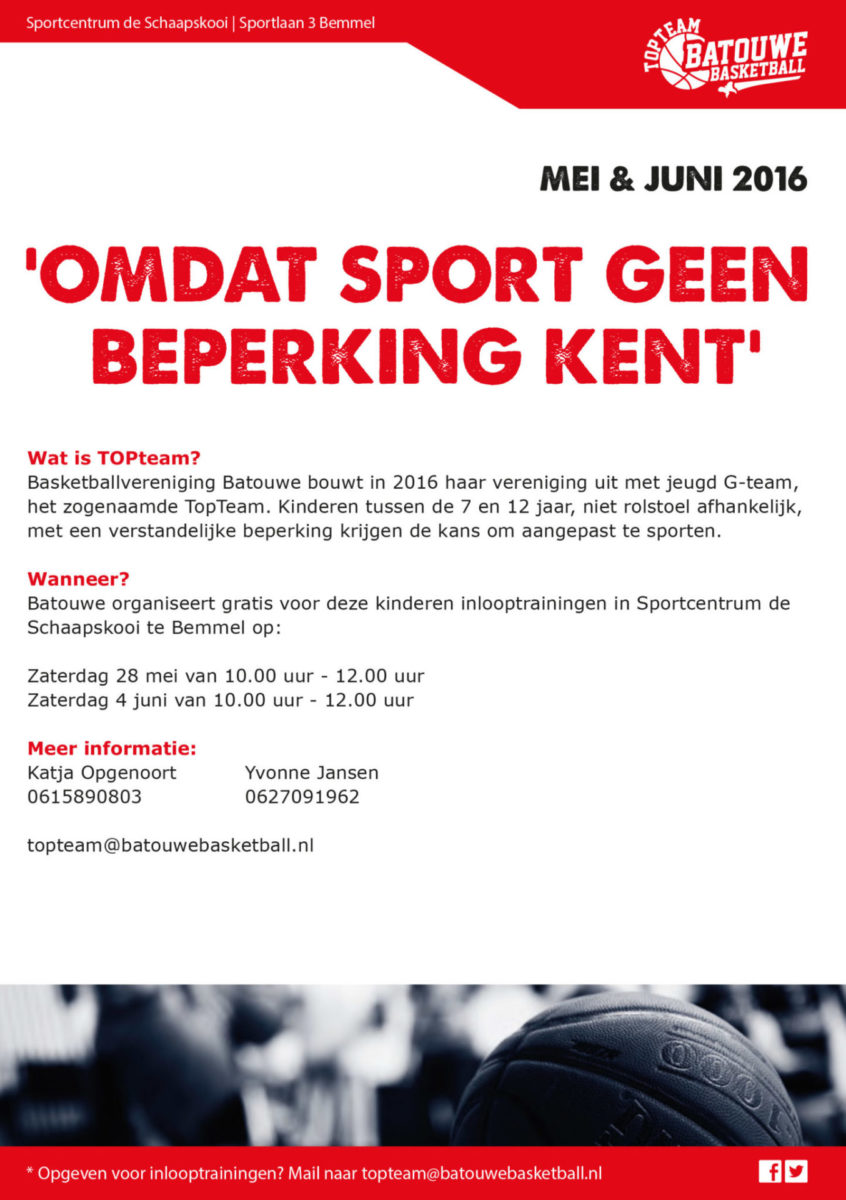 Vanaf 30 augustus a.s. wil basketbalvereniging de Batouwe in Bemmel graag starten met het “Topteam”. Daarom organiseert de vereniging twee inlooptrainingen om te kijken of er vraag is naar G-basketbal. G-basketbal is bedoeld voor kinderen tussen de 7 en 12 jaar, niet rolstoelafhankelijk, die zich primair vanwege hun verstandelijke en/of lichamelijke beperking niet kunnen meten met leeftijdsgenootjes bij een regulier basketbalteam. De inlooptraining vindt plaats op zaterdag 28 mei en zaterdag 4 juni van 10.00-12.00 in Sportcentrum de Schaapskooi, Sportlaan 3 te Bemmel. Bij de training wordt er veel aan basketbalspelen gedaan, maar vooral sfeer, pret en ook de techniek zijn belangrijk. De inlooptrainingen vinden eenmalig plaatst onder begeleiding van twee ervaren eredivisie speelsters van de Batouwe. Natuurlijk zullen er ook enkele vrijwilligers ondersteunen om de spelers te kunnen begeleiden. Het kader heeft ervaring in de begeleiding van sporters met een beperking. Kom jij ook een keer basketballen? De trainingen zijn gratis en je kunt alleen basketbal leren door te doen! Opgeven is niet verplicht, maar wel wenselijk. Dit doe je door een email te sturen naar topteam@batouwebasketbal.nl