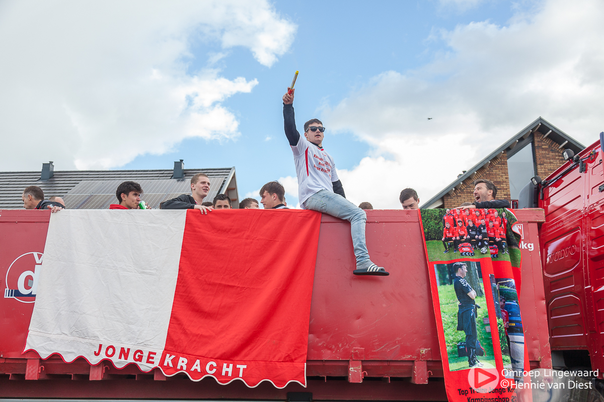 Op 4 mei speelde het team van Jong Kracht Huissen om het kampioenschap Hoofdklasse tegen ESA J019 1 uit Arnhem. Dit hadden zij in de vorige wedstijd tegen het team van De Bataven ook al kunnen behalen, maar toen werd er 2-2 gelijk gespeeld. Zoals trainer Jeroen Neuhaus voor de wedstrijd al aangaf kon het eigenlijk nu niet meer mis gaan. Voorafgaande aan de wedstrijd had het team van Jonge Kracht namelijk een voorsprong van 12 punten op Beuningse Boys en ook nog een veel beter doelsaldo nl. + 54 t.o.v. +19 en dat met nog maar 4 wedstrijden te spelen. Voor de trainer was het extra leuk dat zijn zoon Raf ook nog eens “pupil van de wedstrijd” was en daarom de aftrap mocht verrichten. Bij het betreden van het veld werden spelers en scheidrechter “verwelkomd” met een rookgordijn door handfakkels ! In de 1ste helft was het team van ESA de gevaarlijkste ploeg, maar zelfs een “100%” kans werd niet benut. Bij een van de aanvallen was Jonge Kracht echter wel trefzeker en daardoor werd een ruststand van 1-0 bereikt. Deze voorsprong gaf het team na de rust extra inspiratie om de wedstrijd definitief te gaan beslissen. Mede door een uitstekend genomen penalty is de eindstand dan ook 4-1 geworden (en niet zoals het scorebord aangaf 9-1) en kon de feestvreugde ingezet worden. De omroeper moest tijdens de wedstijd wel enkele keren een waarschuwing omroepen dat het laten ontploffen van “bommen” tot staking zou kunnen leiden. Na ontvangst van de kampioensschaal, bijbehorende bloemen en felicitaties -ook vanuit ESA- gingen spelers en trainer in de kleedkamer pas echt los! Als afsluiting maakten zij een rondgang op de “kar” door Huissen. De Gemeente heeft geweten dat Jong Kracht een kampioenschap te vieren had !