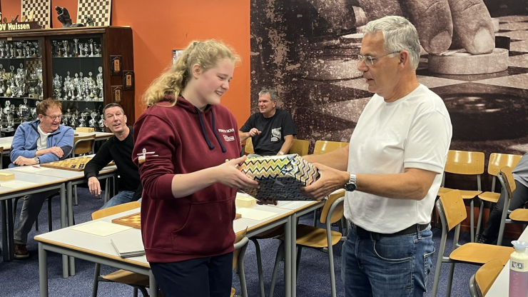In een gezelschap van zeer sterke speelsters ging Fleur na een boeiend toernooi met veel spannende partijen uiteindelijk met de hoogste eer strijken. Reden genoeg om daar extra aandacht aan te besteden. Voorzitter Jos Stokkel feliciteerde haar namens alle clubgenoten.