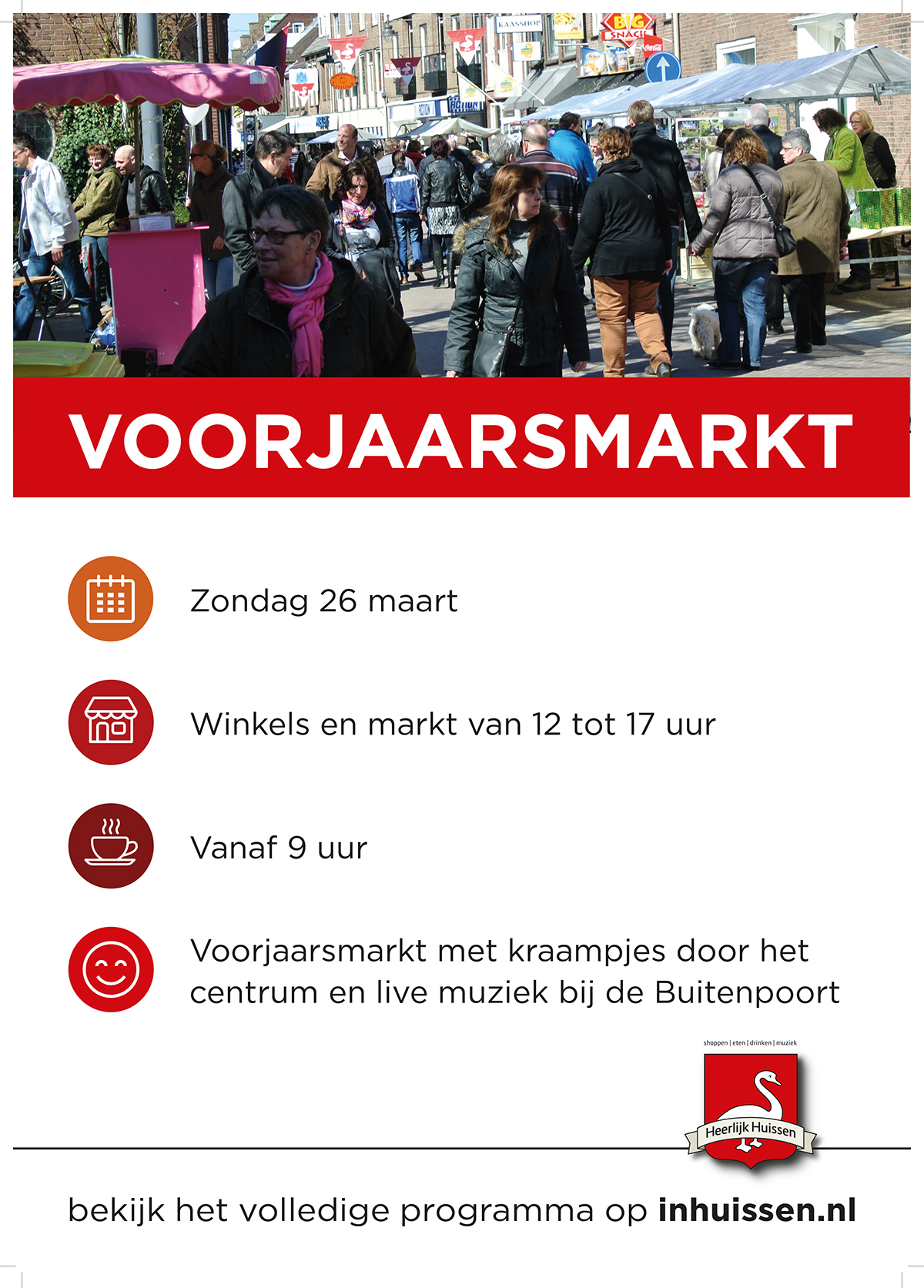 HUISSEN – Het centrum van Huissen bruist zondag 26 maart van gezelligheid. De ondernemers hebben hun winkels van 12.00 tot 17.00 uur geopend en in het centrum is een heuse voorjaarsmarkt. Kom gezellig shoppen, een terrasje pikken en geniet van de live optredens bij De Buitenpoort.