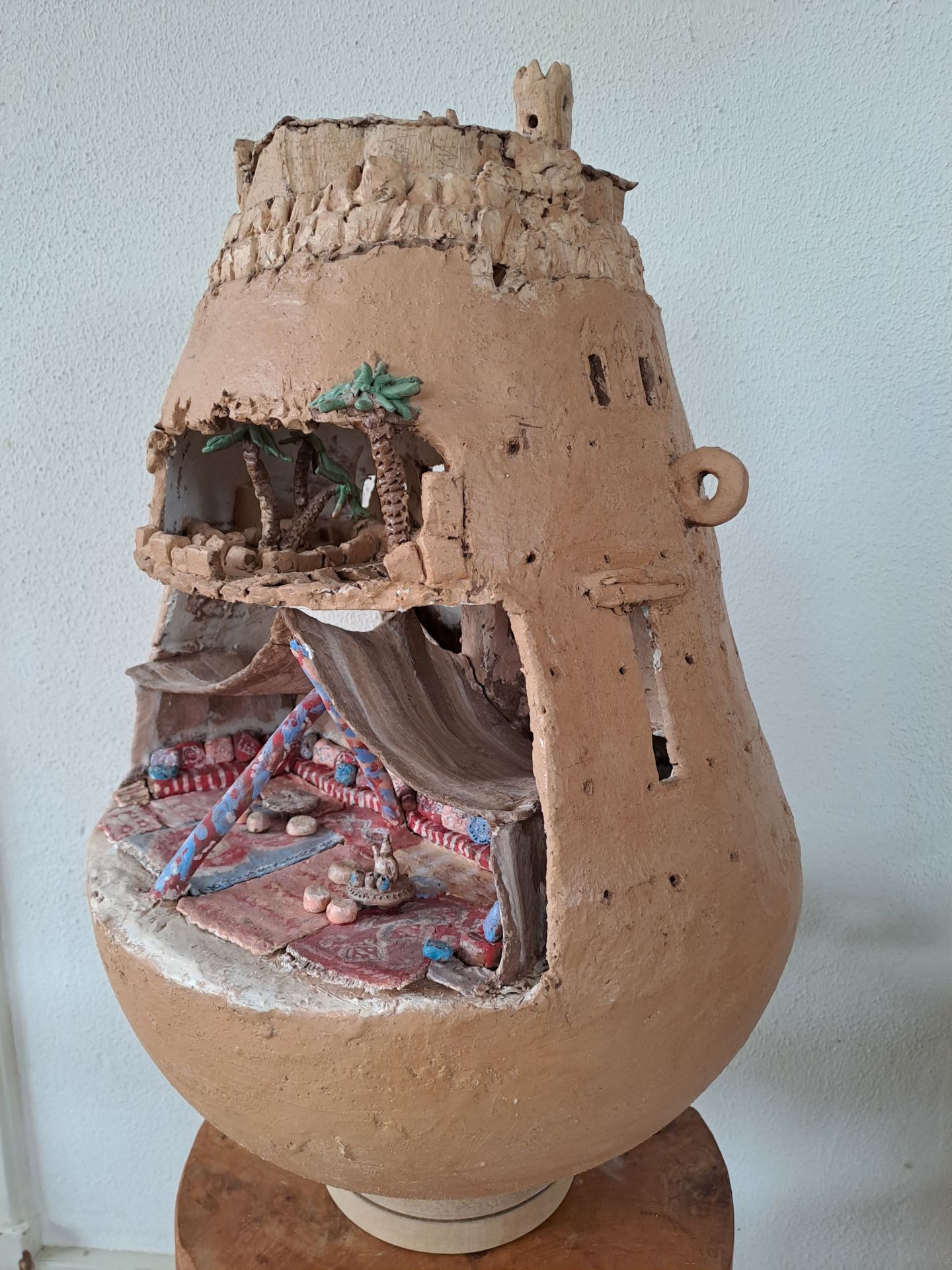 In deze tentoonstelling laat zij vooral werken zien die zijn uitgevoerd in leem en klei. De inspiratie komt van de oude lemen gebouwen en een dorp in Marokko. In de expositie kunt u zien hoe zij deze inspiratie omgevormd heeft tot 3D werken in potten, kastjes en reliëf schilderijen met leem. Uniek en bijzonder!