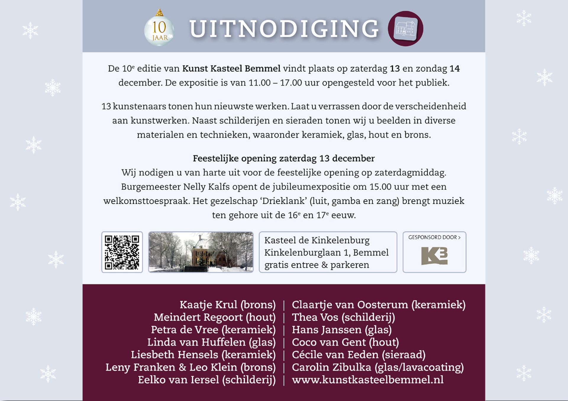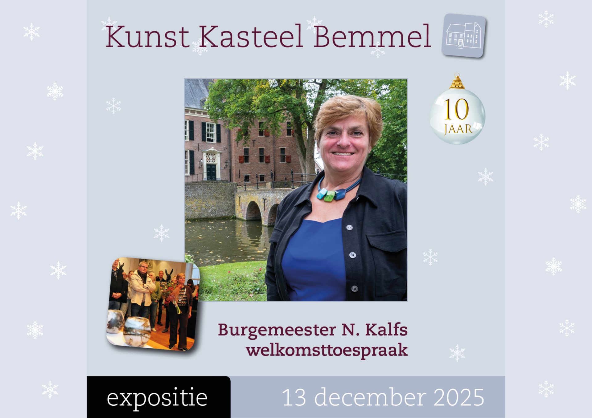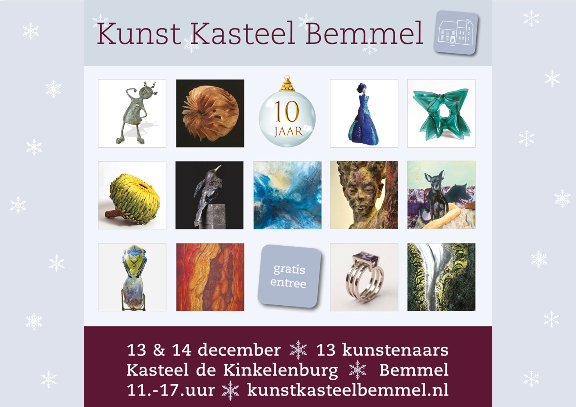 De 10e editie van Kunst Kasteel Bemmel vindt plaats op zaterdag 13 en zondag 14 december. De expositie is van 11.00 – 17.00 uur opengesteld voor het publiek.