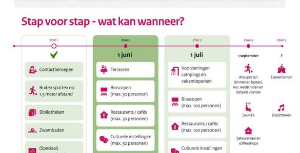 Rijksoverheid 19-05-2020 Zolang het coronavirus onder controle blijft, komt er stap voor stap meer ruimte. Per 1 juni kunnen we in Nederland opnieuw enkele maatregelen versoepelen: ‘alleen’ wordt weer iets meer ‘samen’...