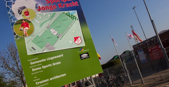Na de onthulling van het grote reclame bord aan de Bloemstraat was het de beurt aan de ereleden van v.v. Jonge Kracht om gezamenlijk met de wethouders Sluiter en Jansen de middenstip van het hoofdveld veilig te stellen...