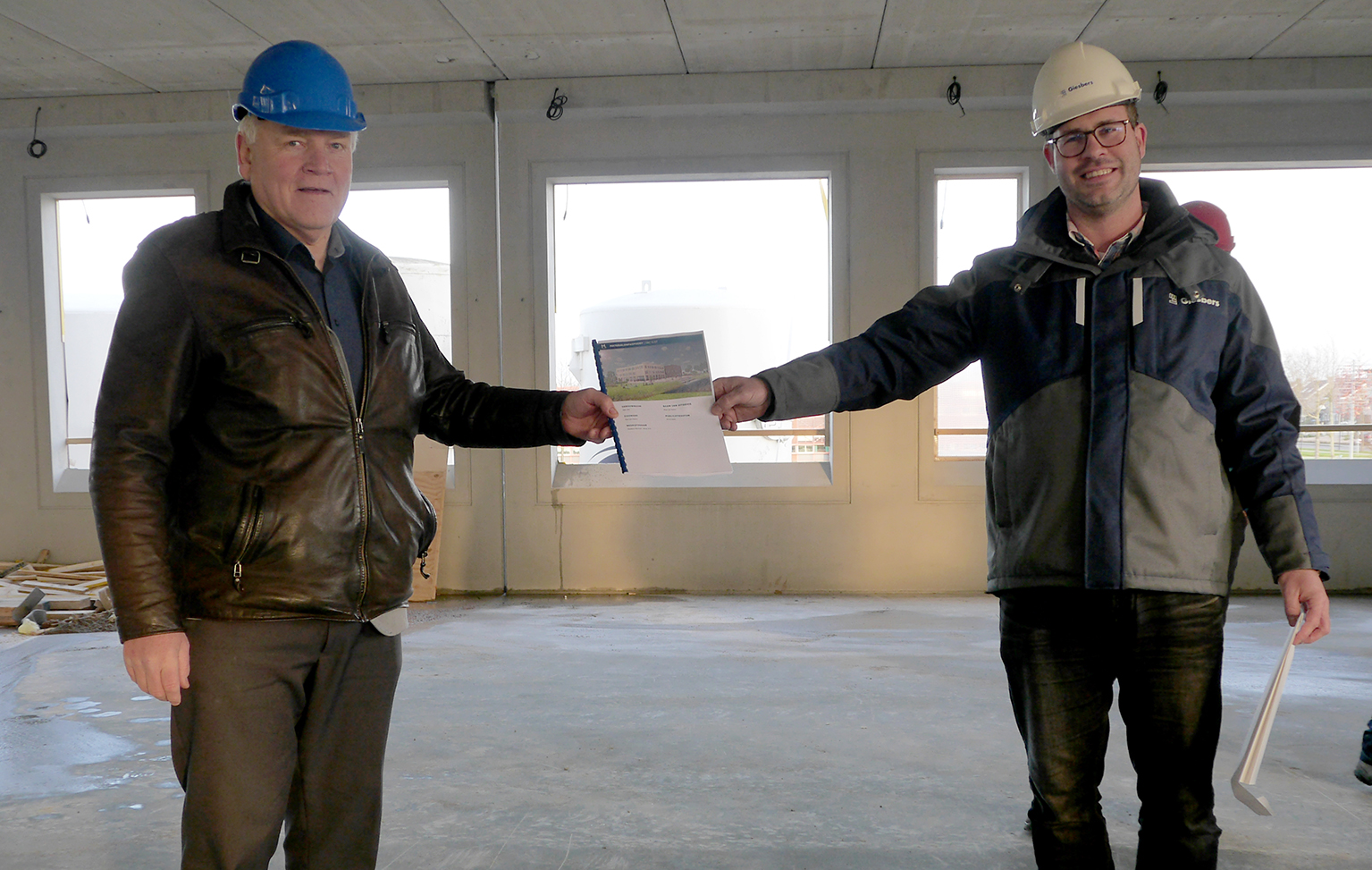 Het is zover, het nieuwe schoolgebouw van OBC Elst heeft haar hoogste punt bereikt. Na het hijsen van de vlag werd de directie van de school door Giesbers Ontwikkelen en Bouwen verrast met een uniek materialenpaspoort. Hiermee is OBC Elst de eerste middelbare school in Nederland met een materialenpaspoort.