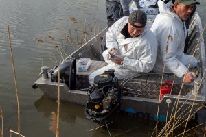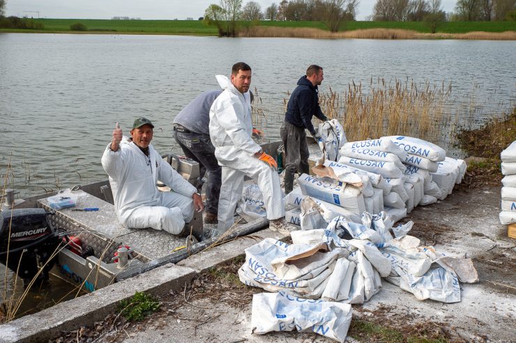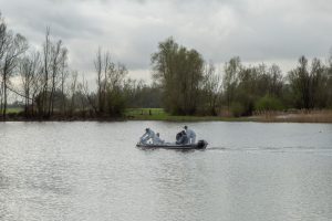 Afgelopen zaterdag 4 april hebben vrijwilligers van Hengelsportvereniging St. Petrus opnieuw een belangrijke bijdrage geleverd aan de waterkwaliteit van de Grote Bloem bij Huissen. Met behulp van bootjes werd het middel Ecosan over het water verspreid.