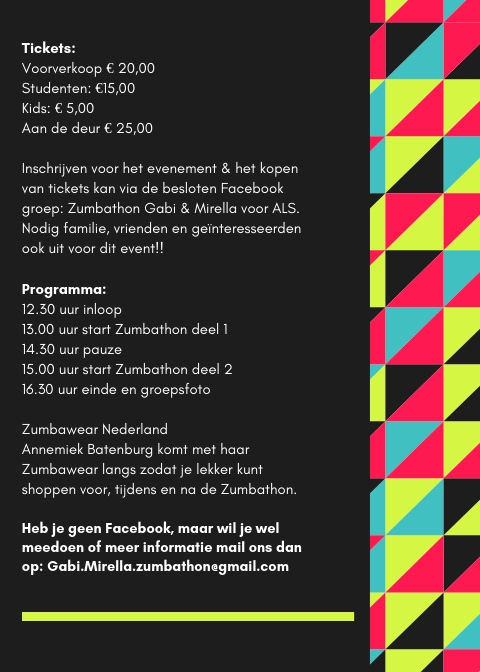 Voor meer informatie of de link naar het inschrijfformulier, ga naar het evenement op Facebook (Zumbathon Gabi&Mirella voor ALS) of stuur een e-mail naar gabi.mirella.zumbathon@gmail.c